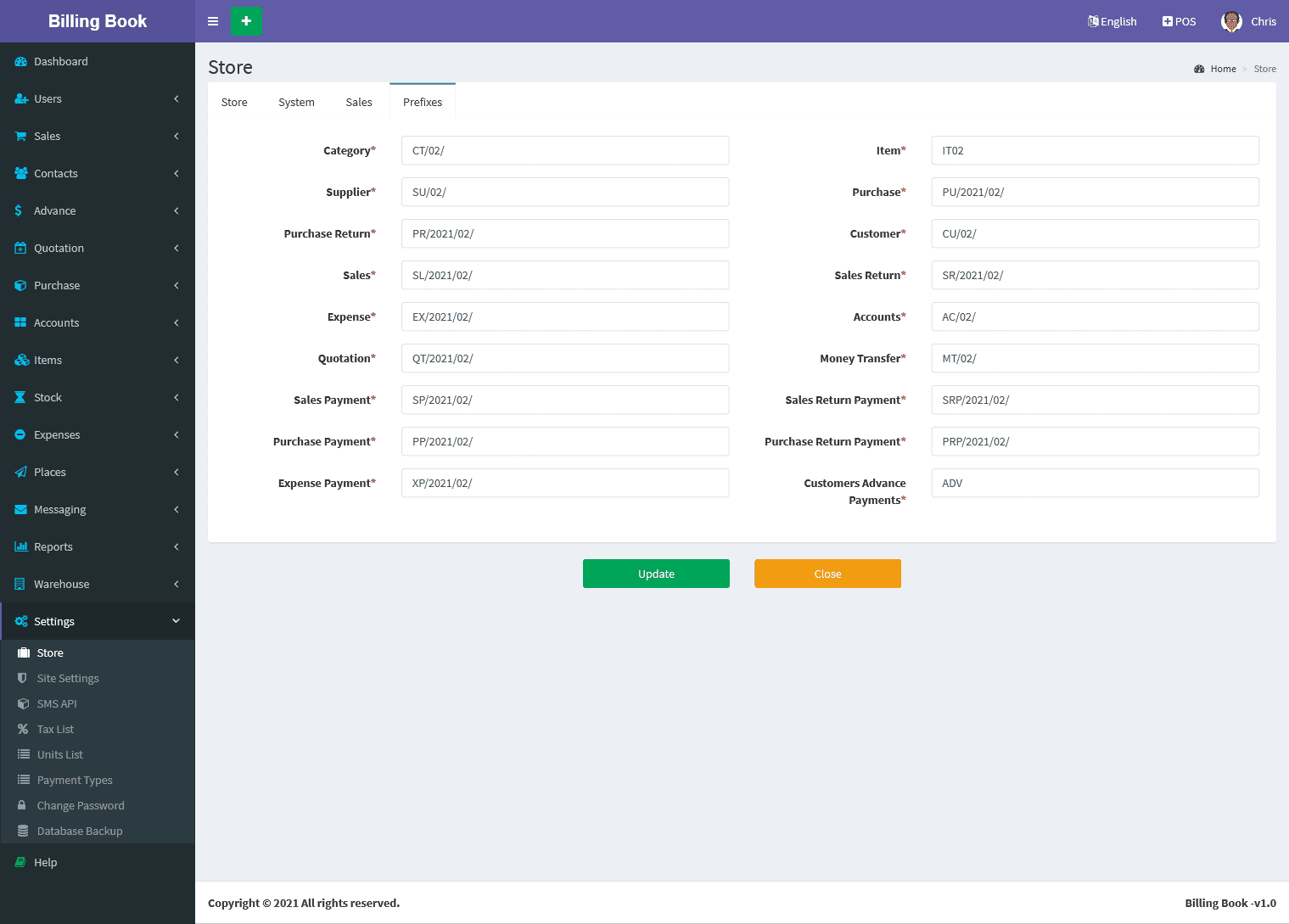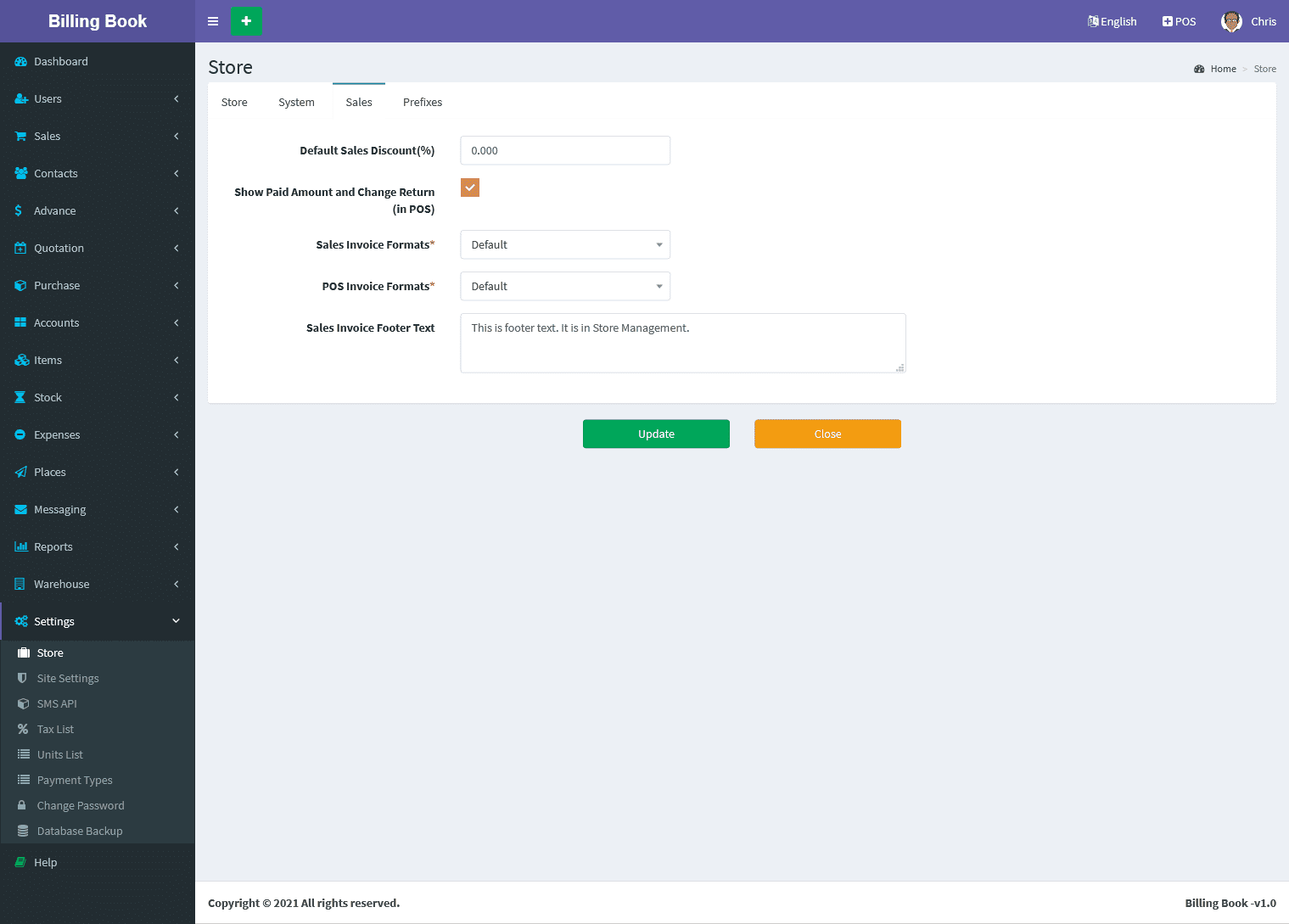 You can update the store profile information's like Store name, Phone, Mobile, Email, GST Number, VAT Number, PAN Number, Bank Details, Website link, Country, State, Postcode,Address and Invoice Logo.