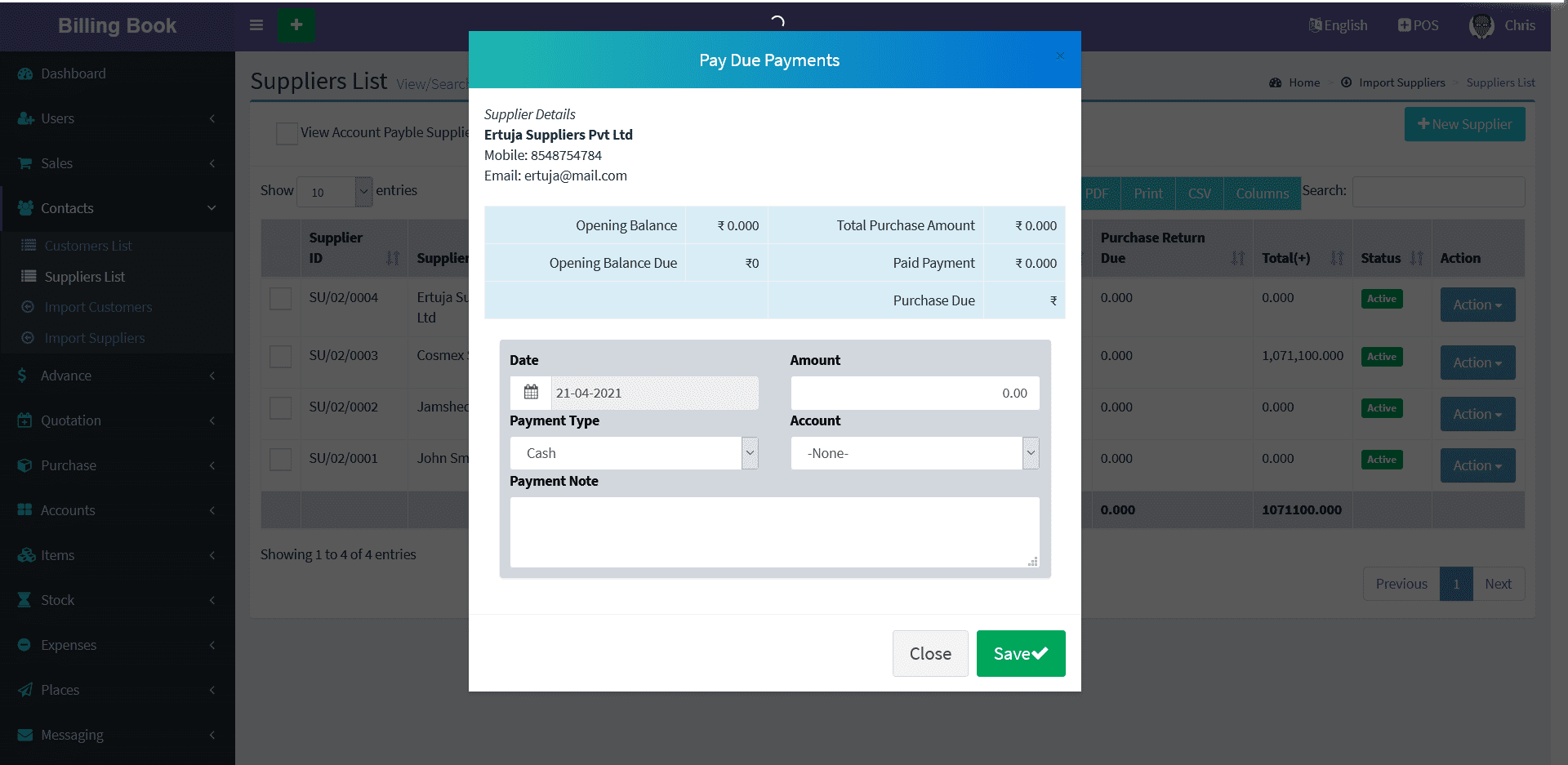 Suppliers -> Suppliers List -> Action Button -> Due Payments